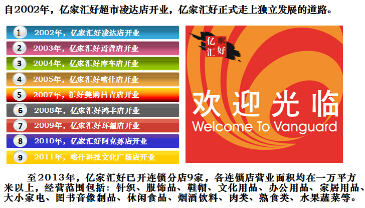 億家匯好商貿(mào)有限責(zé)任公司于2002年成立,并從臺灣引進(jìn)連鎖經(jīng)營職業(yè)管理團(tuán)隊(duì),統(tǒng)一管理旗下各地的連鎖超市。公司通過多年的穩(wěn)健發(fā)展,至2013年底,億家匯好商貿(mào)有限責(zé)任公司已成為擁有員工近3000多人,下轄一個配送中心和9家連鎖超市的大型綜合性零售企業(yè)。總經(jīng)營面積11萬多平方米,配送中心輻射公司所有超市,年配送額可達(dá)2億元。公司大量吸納下崗職工,經(jīng)過崗前培訓(xùn),提高勞動技能,實(shí)現(xiàn)了他們的再就業(yè),為維護(hù)社會和諧穩(wěn)定做出了貢獻(xiàn)。2013年,巴州億家匯好商貿(mào)有限責(zé)任公司在自治區(qū)零售業(yè)中穩(wěn)踞前三位,是自治區(qū)重要的流通龍頭企業(yè),2013年年銷售收入達(dá)10億人民幣。多年來,公司一直重管理、抓實(shí)效、運(yùn)用先進(jìn)的管理手段和營銷理念,秉承億家匯好人 時時尋求效率創(chuàng)新,事事講究專業(yè)技術(shù)的文化精髓,創(chuàng)造了良好的經(jīng)濟(jì)效益和社會效益。公司先后多次被消費(fèi)者協(xié)會評為誠信單位,并多年被評為重合同,守信用單位。